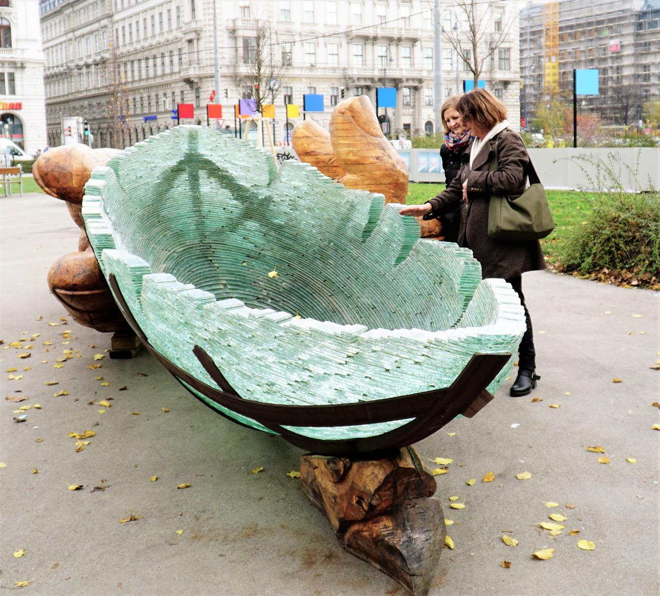 Dann klappte an diesem Tag der Transport wie am Schnürchen. Alles blieb auf dem Weg von Leipzig nach Wien heil und die Glasarche trifft pünktlich ein an diesem kühlen Morgen des 22. November an der Votivkirche. Schnell ist der endgültige Liegeplatz im Sigmund Freud Park ausgemacht, etwas geschicktes Manövrieren mit dem Truck und dem zugehörigen Kran, etwas Muskelarbeit noch, dann sollte alles stehen – feine Kunst ist eben auch Schwerstarbeit. Das eingespielte Team hat kaum die riesige Hand aus Eichenholz abgelegt und gesichert kommen die ersten Interessierten, stellen Fragen oder posieren einfach fürs Fotoalbum.